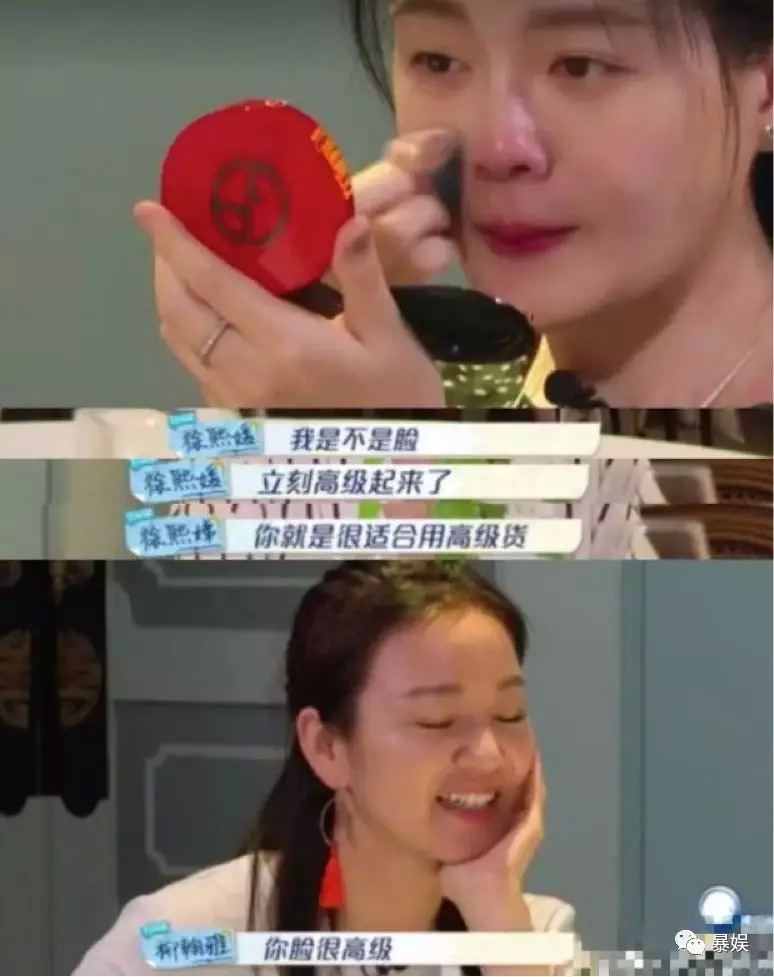 大S向阿雅推荐广告植入的粉底产品,说用了“脸会立刻高级”,阿雅也很识趣的夸大S的脸“很高级”。