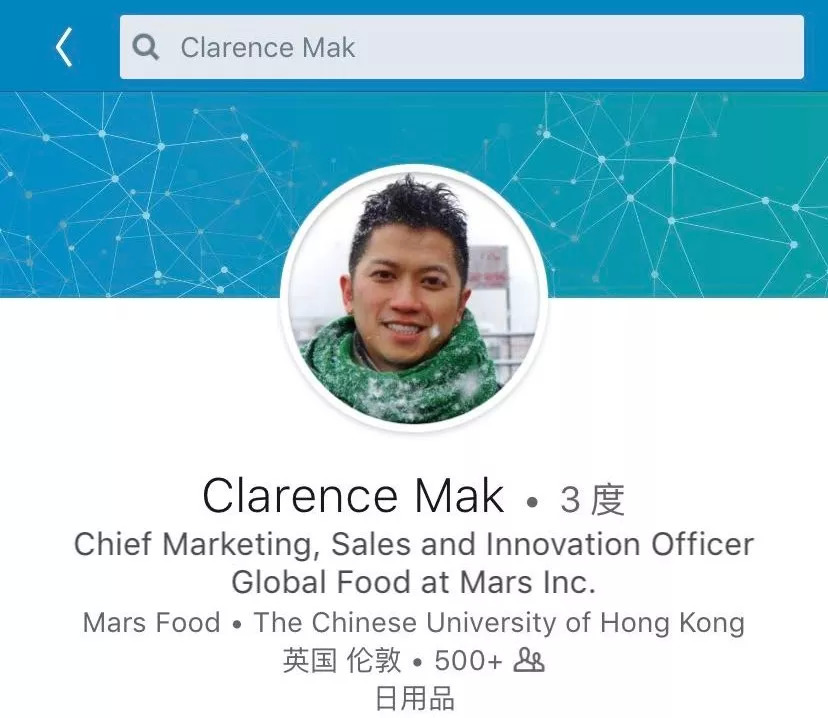 即将接任玛氏箭牌中国区总裁的麦伟坚领英主页