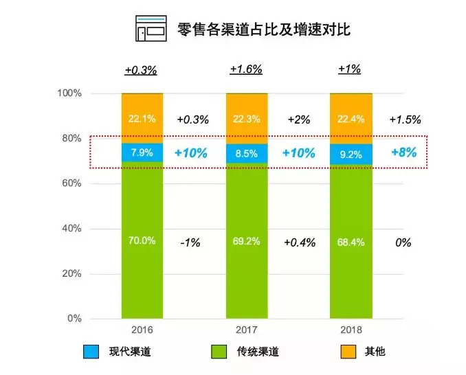 据尼尔森2016-2018连续3年的线下零售渠道普查数据显示,传统渠道的店铺占比在不断下降,逐年向现代渠道(包括大卖场、大超市、小超市和便利店)转移。