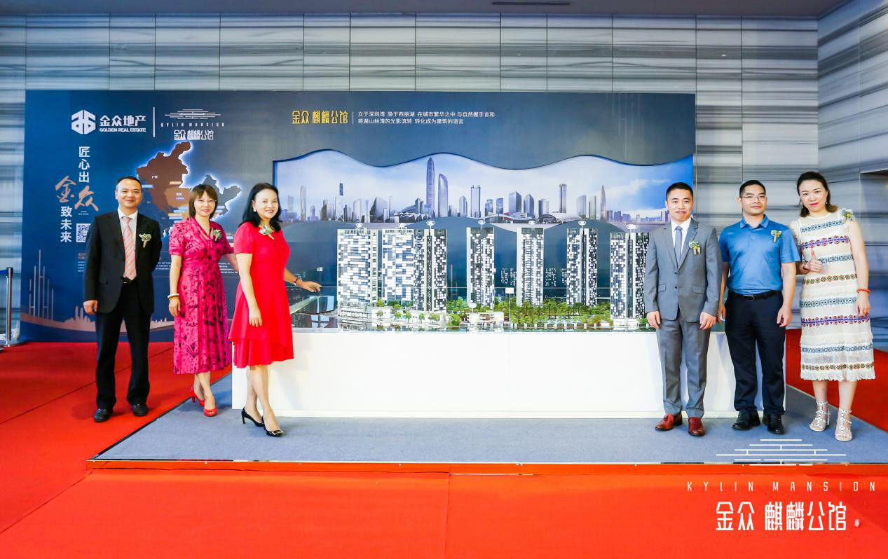 接下来,金众地产杨总与金众地产综合管理部总经理刘其明、深圳中原二级市场副总经理张艾菲、深圳中原二级市场事业一部董事总经理范霞、世联行综合事业一部总经理陆焕、后海广告总经理彭江莉女士一起共同上台,在现场热烈的掌声与期待下,正式完成展厅开放揭幕仪式。这是备受关注的金众麒麟公馆首次公开亮相,金众地产历时5年,以深圳顶豪的匠心追求,开启全新公馆系豪宅时代。