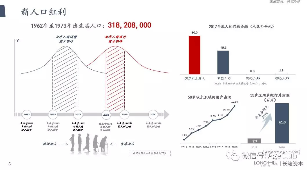 并且这个群体在事业发展期中获得了稳定的退休收入,具有较大的消费潜力。这个过程会出现历史性的机会,在这个机会里面会诞生出各种新的业态。创业者要抓住老龄化的机会,不能仅仅是做增量型产品,更需要去细分这个群体,因为这个人群在不停地发生变化。比如在互联网行为上,中老年微信用户在过去两年的时间内增长了七到八倍。而且会有更多中老年人学会使用微信,并且使用技能不会随时间遗忘。而使用微信的中老年用户不仅是人数在增加,而且用户本身也在发生变化。在中老年消费行业中,不管是健康领域,还是消费领域,最需要的是供给侧改革。目前行业很缺乏对中老年人群的细分,也很缺乏高品质的产品和服务。