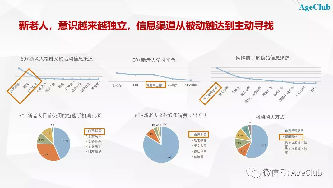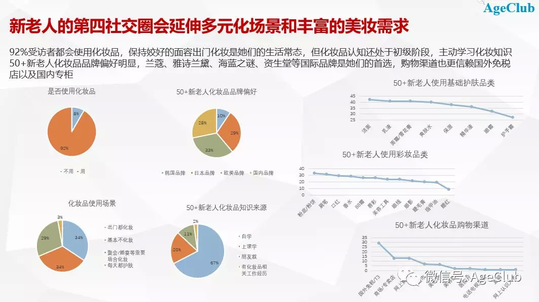 老人退休之后,行为比较活跃的大部分是女性。在50-60岁这个年龄节点,女性的自我意识开始觉醒,其次这些一线新老人的经济也比较富裕,并且这个阶段她们的时间很富裕,有足够时间去释放自我,所以这是新老年人很重要的一个自我释放的阶段。新老年人独立意识也越来越强,对外界传播的许多信息会进行主动寻找。她们对于不同的需求都会有非常清晰的满足渠道及方式,基本上都自己买,或者经过朋友推荐。新老年人过去最重要的三个朋友圈是基于家庭、同学和同事而形成的,而第四个朋友圈是因为其兴趣爱好打开的社交圈,这个社交圈是现在互动频率最高的圈子。