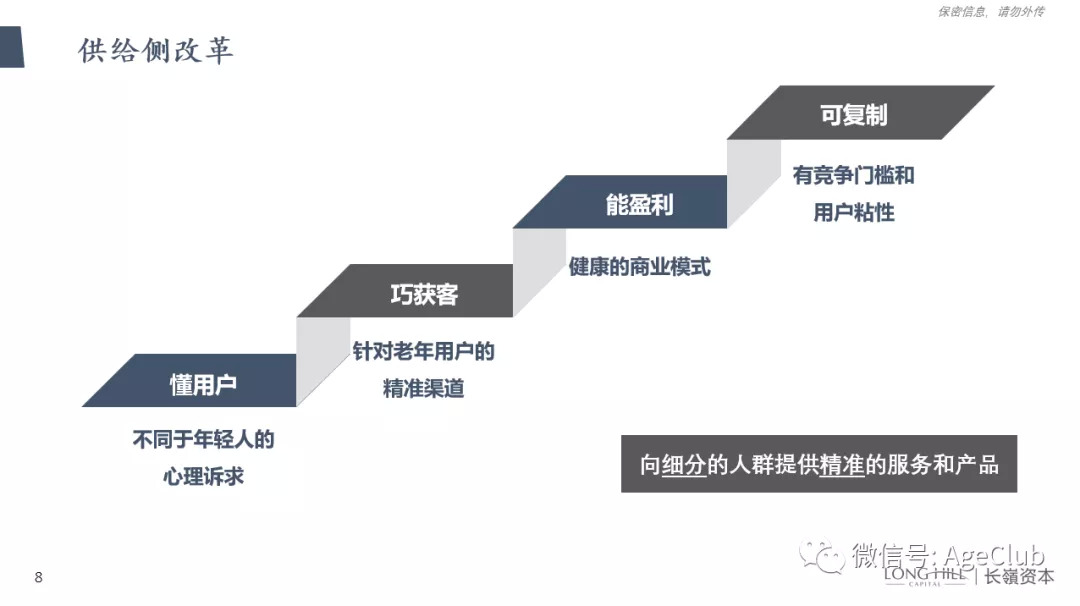 长岭资本投资超过40家企业,这些企业服务了超过800万的个人客户以及超过2万家的商业机构。这些企业有共同的特征,与时下流行的互联网公司有明显的不同。这个不同不仅是目标人群是中老年和年轻人的不同,而且是在商业模式上低频、高客单价、高获客成本,与互联网公司高频、低客单价、低获客成本的特点完全相反。老年产业机会很大,但发展速度不会那么快,挑战就是如何在慢行业里面做出快公司。||退休俱乐部符微:三个差异化打造会员制老年特色生活服务平台