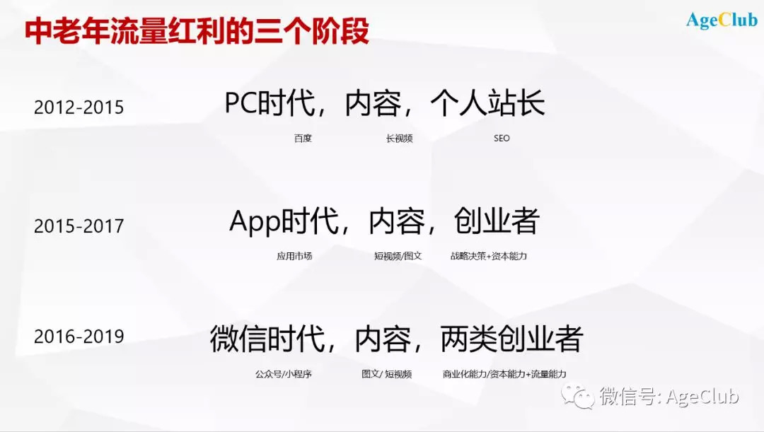 这个阶段中老年用户主要是学习方面的需求,所以对于创业者的核心能力要求只有一项,就是SEO。第二个阶段是2015-2017年。当时智能手机开始在中老年群体里普及,是手机应用市场崛起的时期,APP的单次获客成本只要1.5-2.0元,所以当时的策略就是极力地去买流量。用户对于内容的核心诉求就是“学+秀”,即学习加展示。