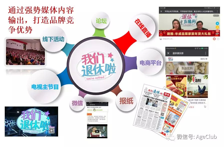 第一,是品牌的差异化,退休俱乐部不只是简单地做产品、做服务,而且以会员为基础,围绕老年人的心理、生理以及物质需求,去打造一个生活服务平台;第二,是定位差异化,目前老年群体的年龄在不断变化,其消费需求也在不断改变。退休俱乐部主要针对一线城市上海消费能力中等偏上的50-70岁中老年人;第三,有了品牌和人群定位的差异化后,接下来就是产品的差异化。退休俱乐部整体来看是一个媒体矩阵,首先用比较主流的电视媒体进行传播,再结合微信和报纸,打造一个全面覆盖的“海陆空”媒体,然后衍生出线下活动、论坛、在线直播等。
