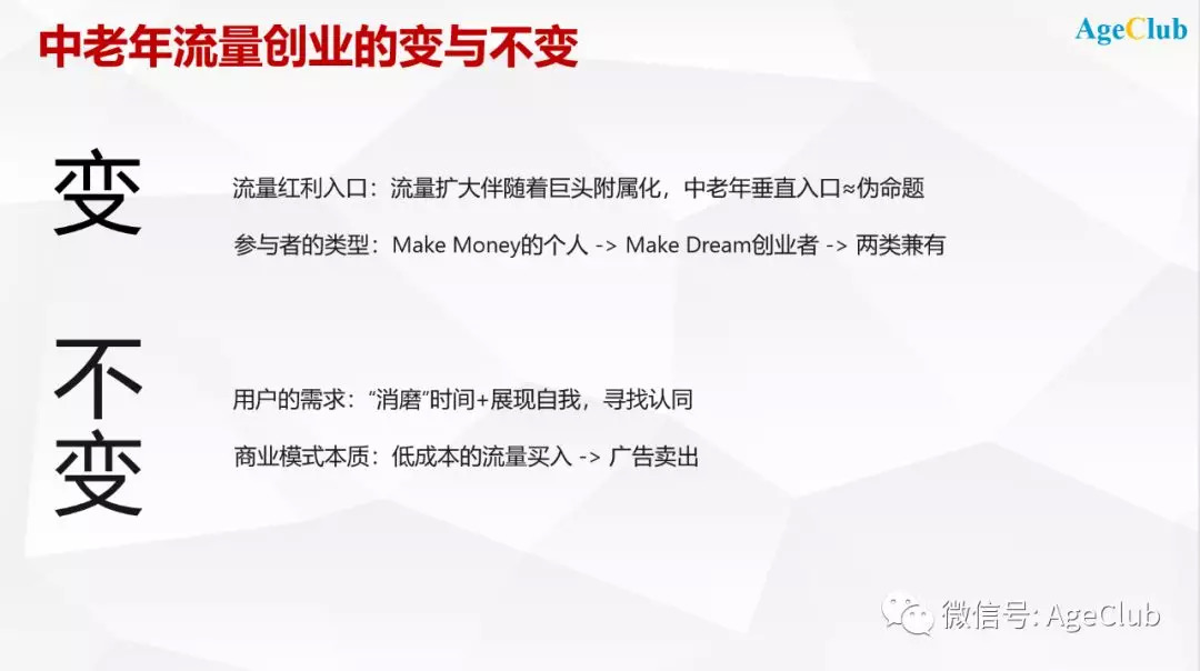 公众号时代的内容实际上还是图文+短视频,而这个时候的变现逻辑就是打广告。因此在这两类创业者当中,真正的核心能力就变成了商业化能力、资本能力和流量能力。在这三个阶段中不变的永远是用户的需求,这个需求实际上是更健康地消磨时间、展现自我和寻找自我认同感。