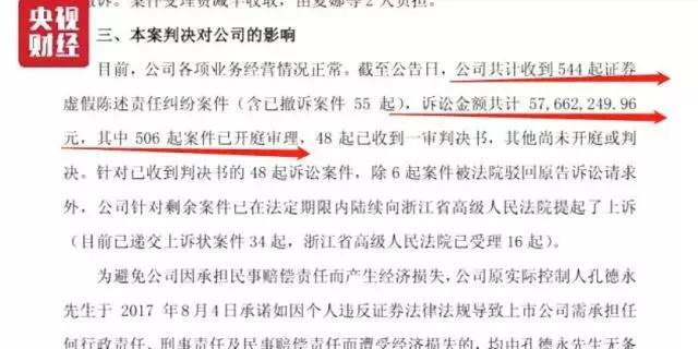 祥源文化诉讼公告显示,截至2019年5月18日,公司共计收到 544 起证券虚假陈述责任纠纷案件,诉讼金额共计5700多万元。拿到一审判决书的有48起,后面还有496起。