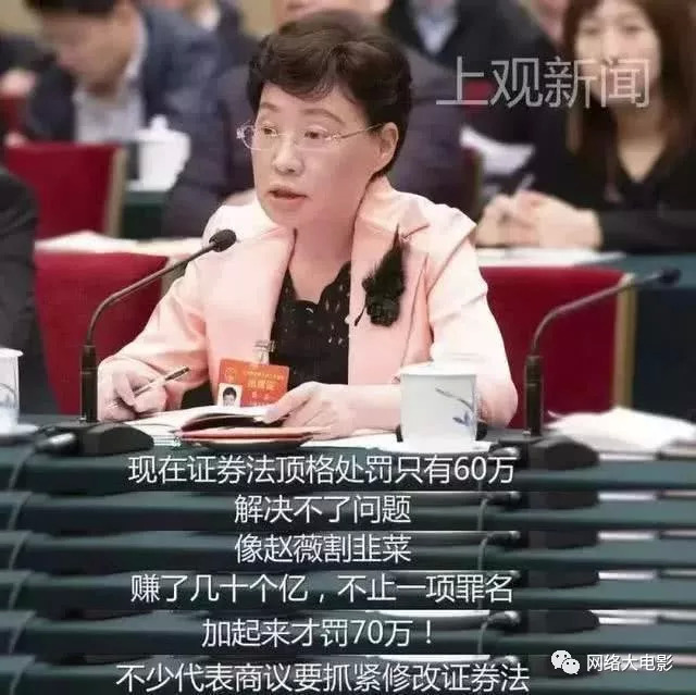 2019年两会期间,人大代表樊云当着证监会主席的面,直接喊话,“现在证券法顶格处罚只有60万,解决不了问题,像赵薇割韭菜,赚了几十个亿,不止一项罪名,加起来才罚了70万”,并提议,对“割韭菜”的上市高管,不仅要罚得“倾家荡产”,还要加重刑期。