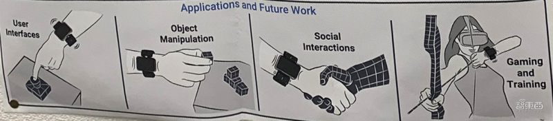 总体而言,Tasbi可以根据与佩戴者交互的内容生成震动提示或者挤压提示,从一边振动到另一边,以模拟接触、碰撞,或者从正面振动到背面,以模拟按动按钮等。Tasbi还可以使用户和全息图等视觉幻象进行交互,为非真实的用户界面提供某种差异反馈感。