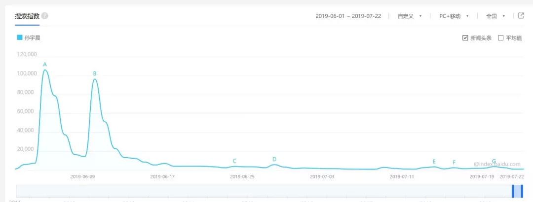 截止7月22日,回顾孙宇晨从拍下午餐后的指数来看,主要形成了两个大的波峰和若干零散起伏。两个最大的波峰,分别是6月4日高价拍下巴菲特午餐一事,和6月9日在媒体上嘲笑王小川和炮轰王思聪一事。
