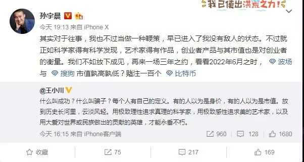 当然,从正常人的思维来看,如果不是看到了孙宇晨朋友圈的截图,王小川也不会记得6年前的那个眼神,更不会想起来跑到微博上解释自己对骗子和成功的理解和定义。