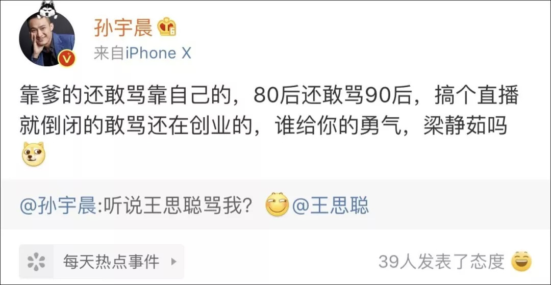 话题人物不嫌多,话题热度也不会嫌太热。王小川事件后,8日,他又连发两条微博直指王思聪:第一条内容是,“听说王思聪骂我”,第二条直接怒斥“靠爹的还敢骂靠自己的”。