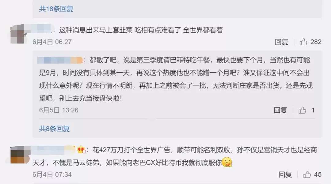 在6月4日4:27发的那条援引彭博社的微博下,有网友表示:都散了吧,说是第三季度请巴菲特吃午餐,最快也要下个月,当然也有可能是9月,时间没有具体到某一天,再说这个热度他也不能蹭一个月吧?
