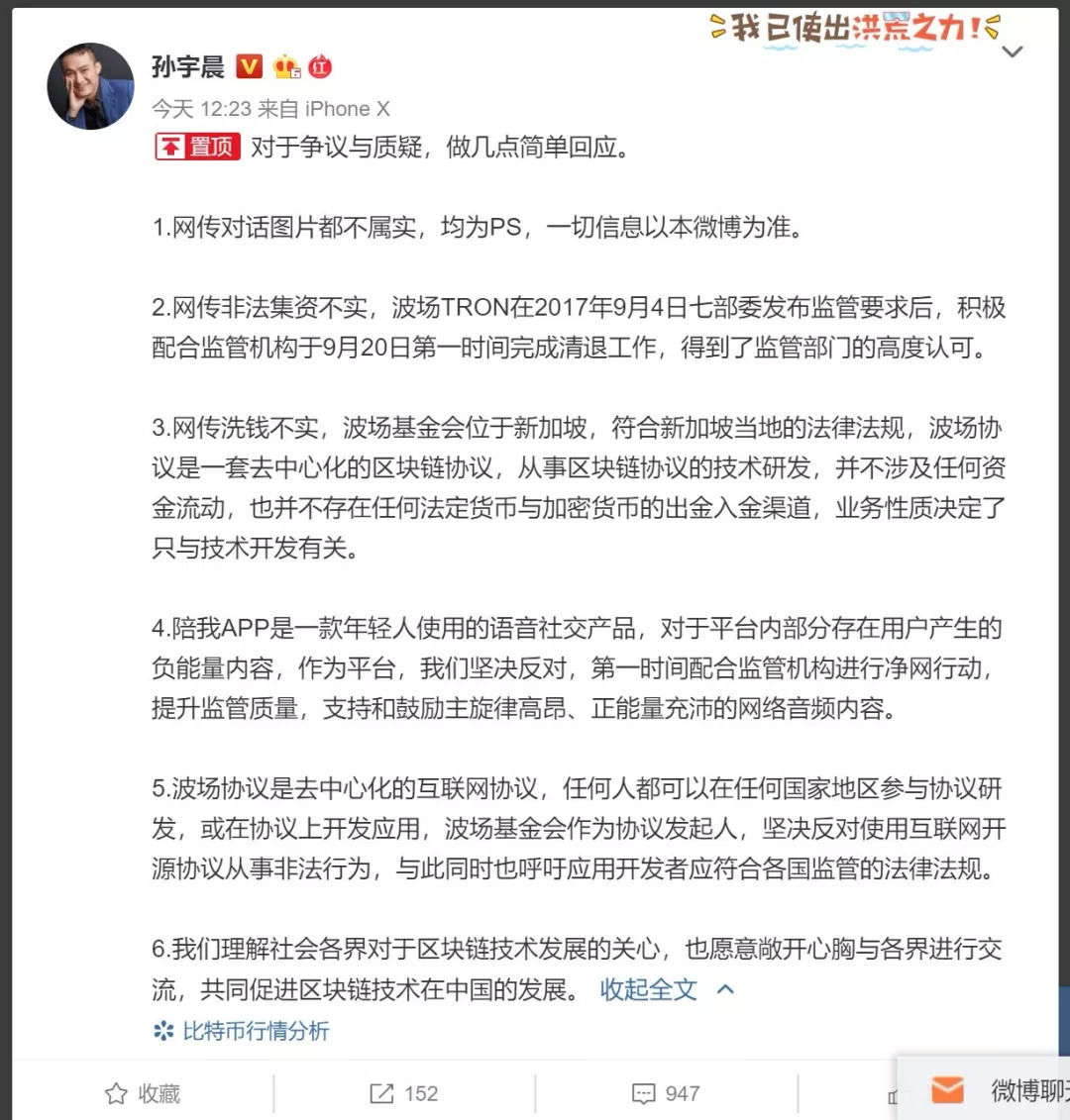 同日12:23,正在医院与肾结石缠斗的孙宇晨在微博给出了回应。
