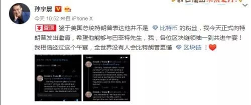 特朗普发布了这条推特后,孙宇晨便趁势在微博上向特朗普发起了午餐会的邀请。