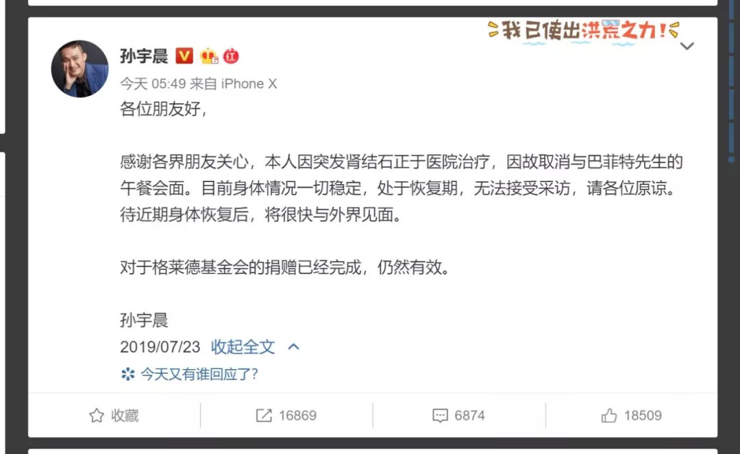 7月23日凌晨5:49,也就是距离原定7月25日的巴菲特午餐还有2天,孙宇晨突然发微博称,“本人因突发肾结石正于医院治疗,因故取消与巴菲特先生的午餐会面。”
