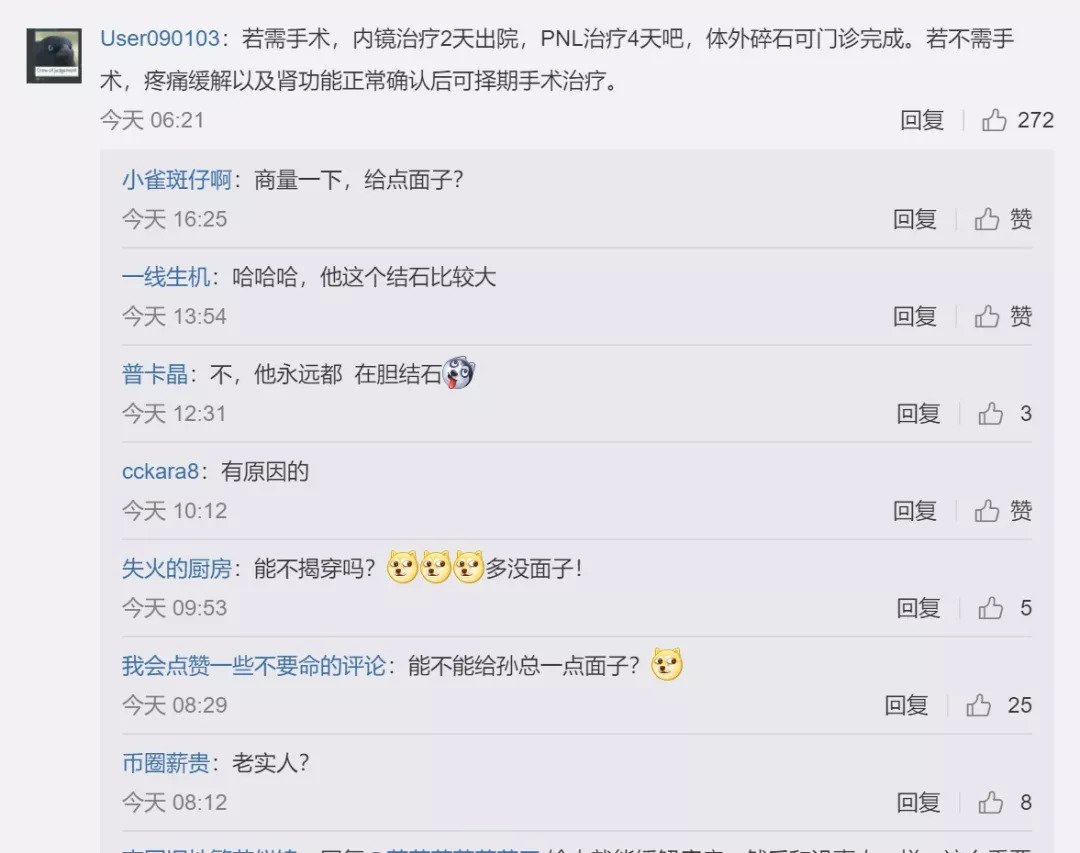 针对评论中的质疑,盒饭财经(ID:daxiongfan)咨询了医生。医生表示,如果石头比较小,只有1-2毫米,每天喝3000毫升的糖水或盐水,每天没事就蹦蹦跳跳,不用手术。如果石头比较大,0.5cm以上的,那就需要做手术将石头震碎,最多一周就能恢复。