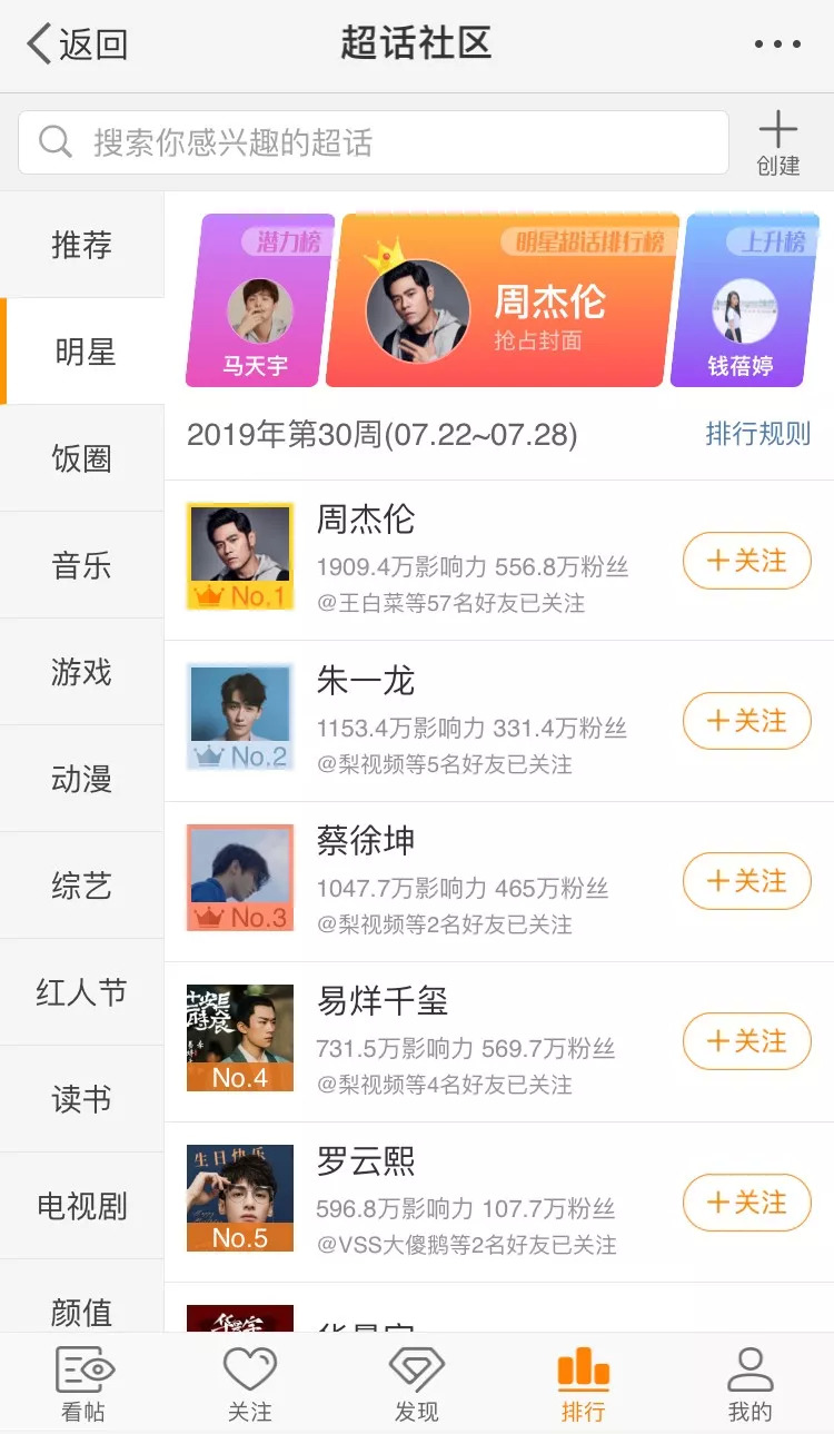 同一时间,排在第二位的蔡徐坤,超话影响力只有前者的一半多一点。