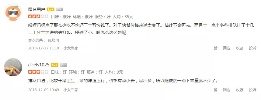 比如,小女当家官方说明的客单价在35元左右,但是实际买单下来,价格一般超过40元,很多男性顾客一般要50元左右才能吃得饱,这就使得很多顾客觉得“不值”。