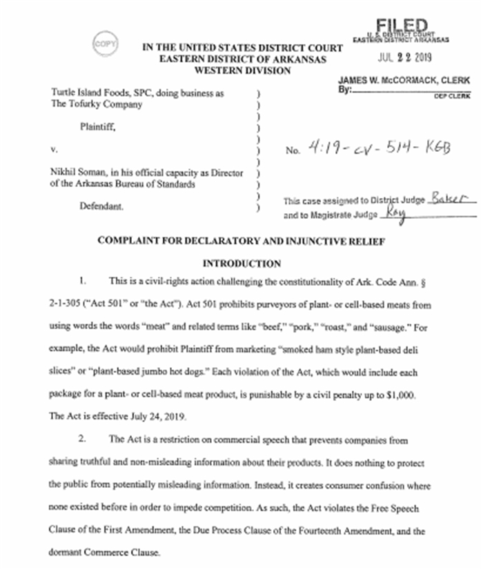 美国公民自由联盟在起诉中称,501号法案“针对素肉和合成肉供应商提出了不利条件”,并且指出没有相关案例能证明消费者被商品上的这些标签所误导。