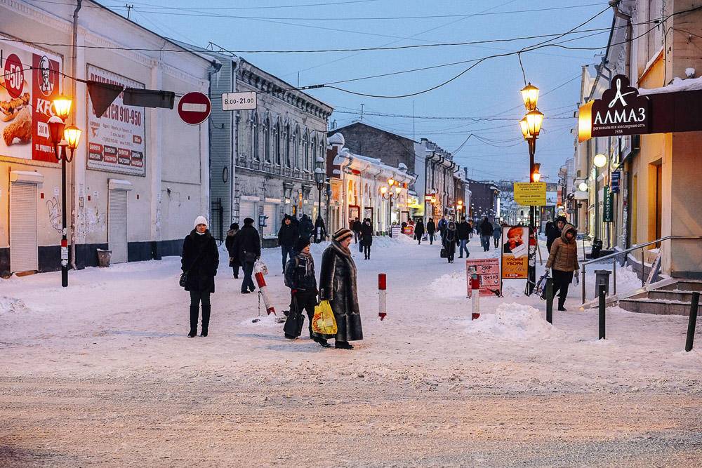 城市不大,被安格拉河环抱着,中心是基洛夫广场(Kirov Square),广场上有一棵巨型的圣诞树,孩子们玩着高高的冰滑梯,他们欢呼奔跑,似乎丝毫不觉得冷。这是仅属于北方孩子的游乐场。马克思大街上,老式电车缓慢经过,每隔几根灯柱,就装着一个小的音响,音乐仍是90年代的社会主义感的旋律。没有流行音乐,但是街边标着“4G”的手机店倒是不少。