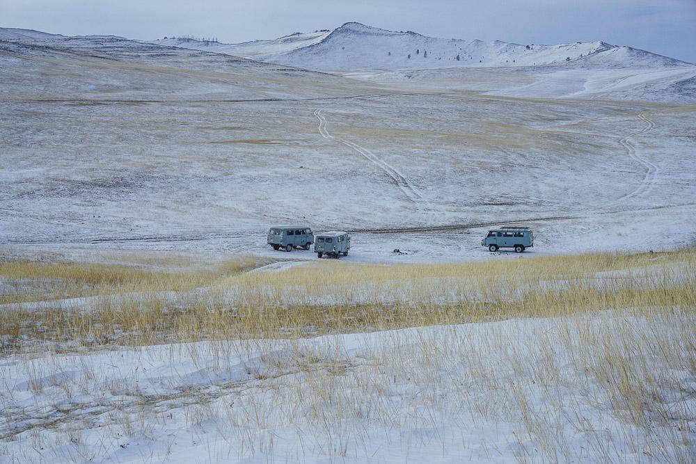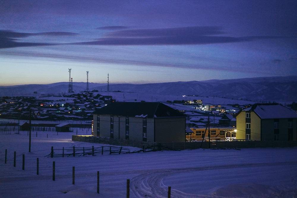 一路上,有种亲临Fargo(《冰血暴》)现场的感觉,几座木屋,稀少的车辆,笔直没有尽头的双向道路。在奥利洪岛的码头,大风吹拂,唯一没有结冰的水域运送着来来往往的人们。车从奥利洪岛上的小码头往胡日尔村开,颠簸得厉害。不同高低大小的木屋,诱人的暮霭天色,车窗上结满冰花。