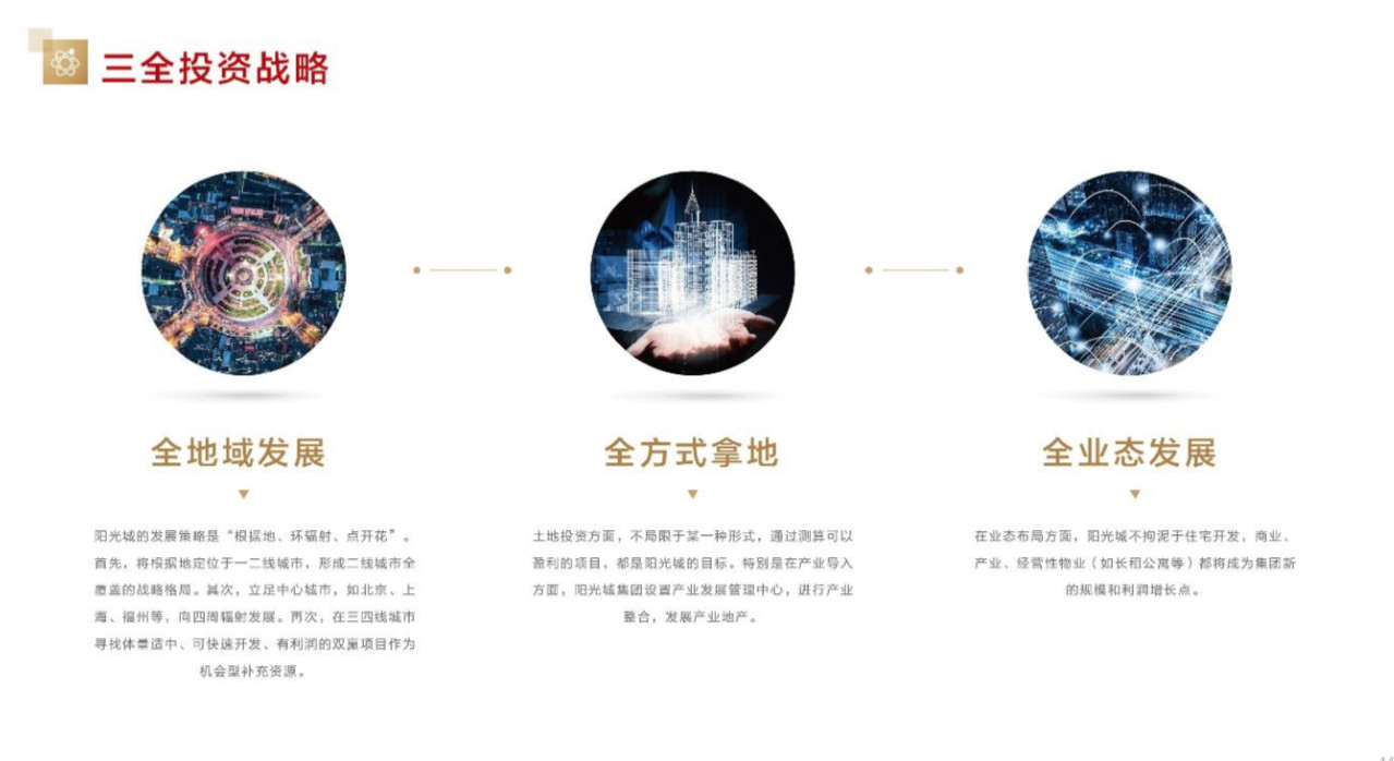 阳光控股,世界500强企业,阳光城作为阳光控股的地产旗舰,业务涵盖地产开发、商业运营、物业服务三大领域,近几年的迅猛发展受行业瞩目。早在2017年,阳光城就提出了“三全五圆”战略,即:全地域发展、全方式拿地、全业态发展。在现有战略布局的基础上,形成二线城市全覆盖的格局。同时开启多元取地通道,并积极拓展更多业态和加速全产业链布局,积极拓展产业地产及园区运营、经营性物业运营等业务。
