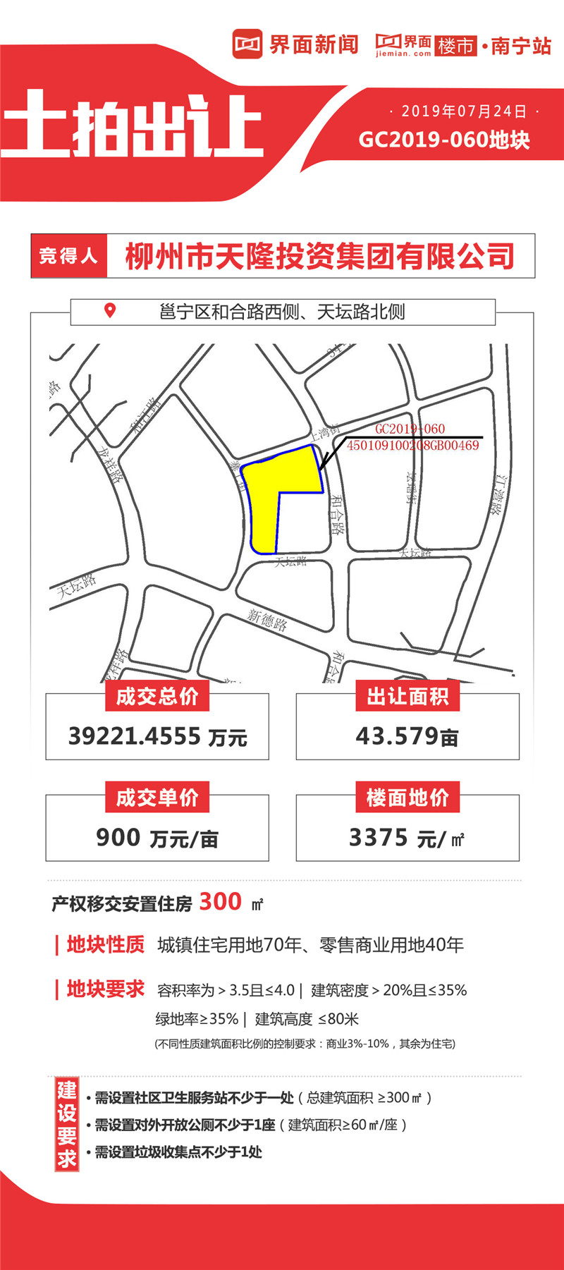 总价39221.4555亿元摘得。该地块成交单价900万元/亩,楼面地价3375元/㎡,产权移交安置住房300㎡(配建比例为0.3%),安置物业不低于57850㎡。这也是柳州天隆首度进入南宁,成功入驻五象龙岗片区。