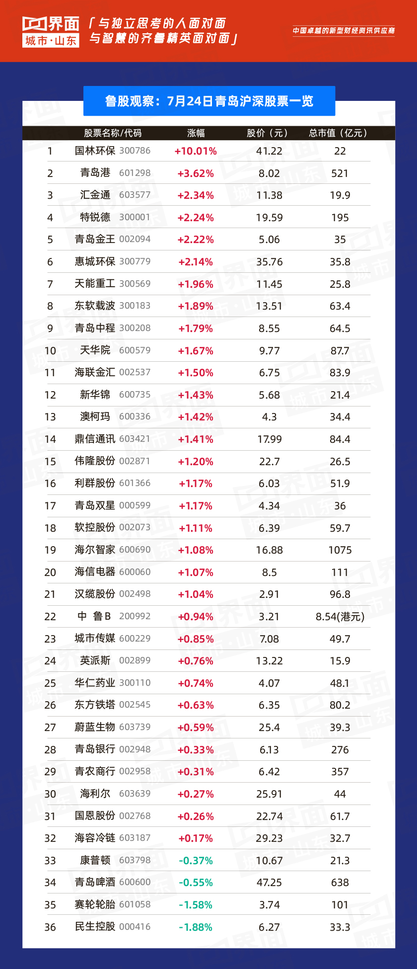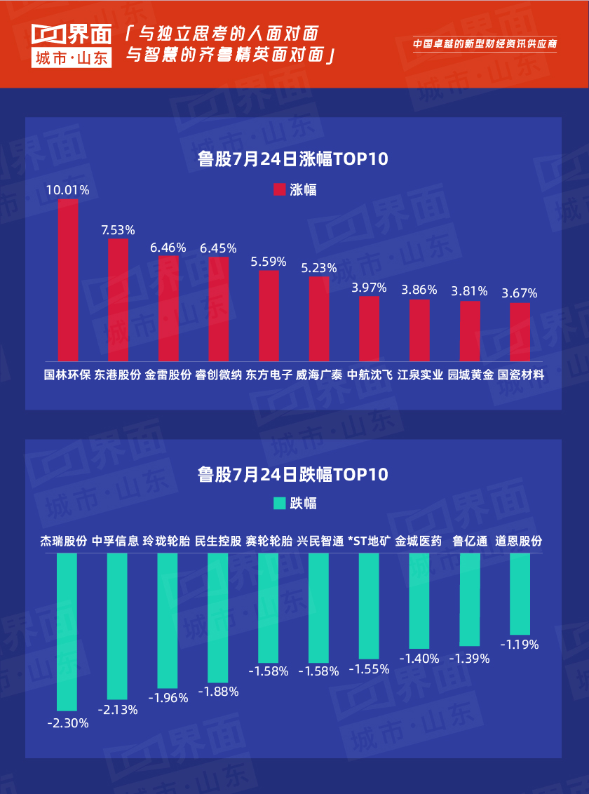 鲁股表现:164只个股上涨,33只下跌,国林环保成为山东7月24日唯一涨停