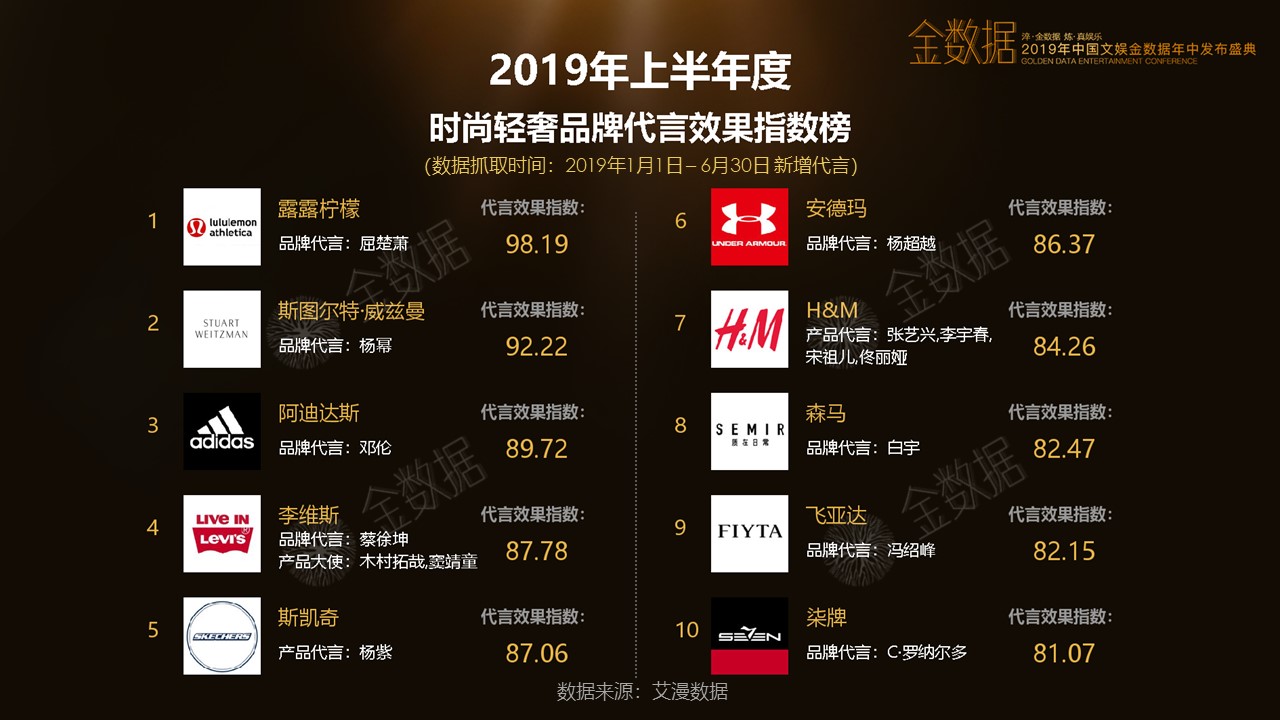 近期由艾漫数据发布的一份《2019上半年中国文娱金数据 》便针对多个明星的时尚品牌代言进行了统计,以直观的数字直接呈现艺人影响力的商业转换效果。