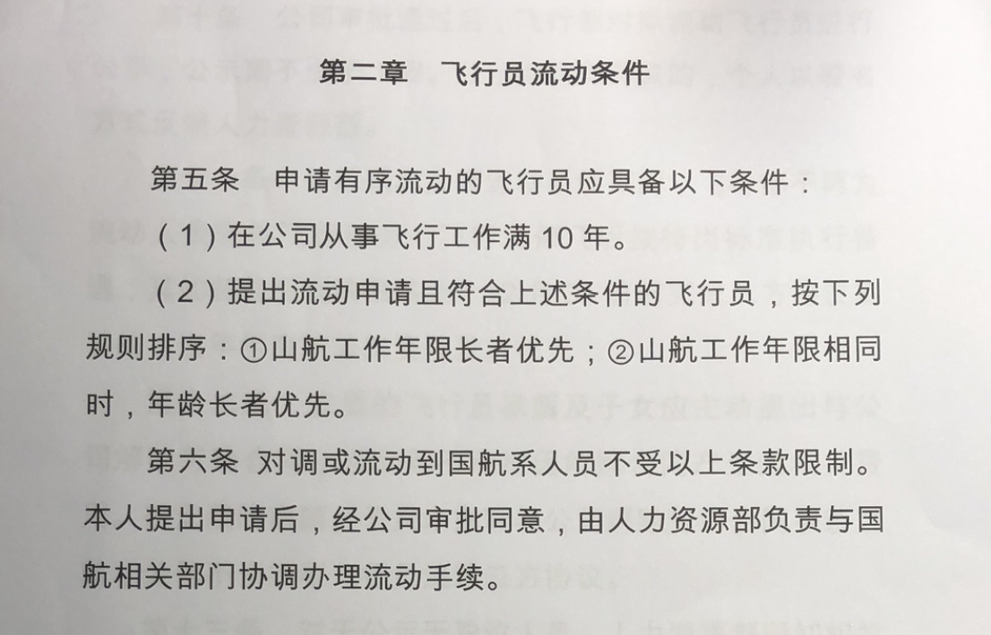 关于飞行员的流动条件,界面新闻获取的一份《山东航空股份有限公司飞行员流动实施办法》显示,山东航空要求,需在公司从事飞行工作满10年者才可申请有序流动;提出流动申请的飞行员,其流动顺序按照工作年限长者优先,年限相同时年龄大者优先。