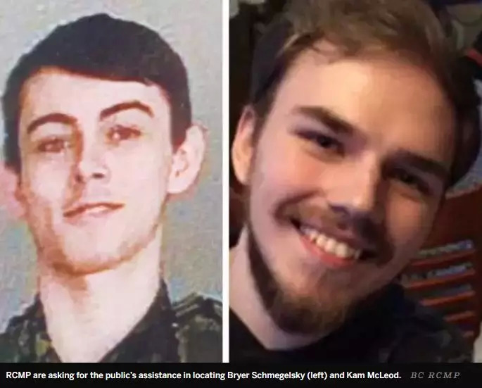 首先是一名男性尸体在BC省Dease Lake附近被发现,离他的尸体两公里左右的路段发现了一辆被烧毁的卡车,而这辆车原本的车主——两名青少年Bryer Schmegelsky(18岁)与 Kam McLeod(19岁)却失踪不见,警方根据当时情况判断二人仅是“失踪”,21号对外宣布时说的也是“失踪”。