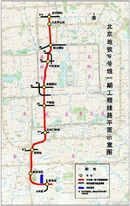 北京地铁19号线又称北京地铁R3线,南起北京新航城,北至朱辛庄站,为线网中南北向骨干快线。一期工程为牡丹园站-新宫站,全程设9站,预计2019年与新机场线同步建成通车,属于新机场线的城区接驳线;二期工程为牡丹园站-朱辛庄站及新宫站-团河站,开工时间待定。