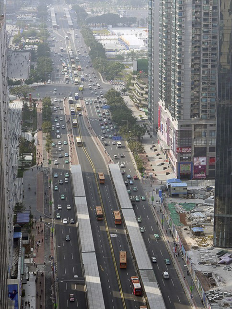 在世界资源研究所小小的会议室里,刘岱宗端来了他的THINKPAD笔记本,打开了一个PPT,在300多页中,他找出了一张广州的照片:宽阔的双向八车道上,密密麻麻的小汽车首尾相接,连成一片。要想在这已经很拥堵的地方拿出四条专用道给公共交通,就意味着道路所有权的重新分配。