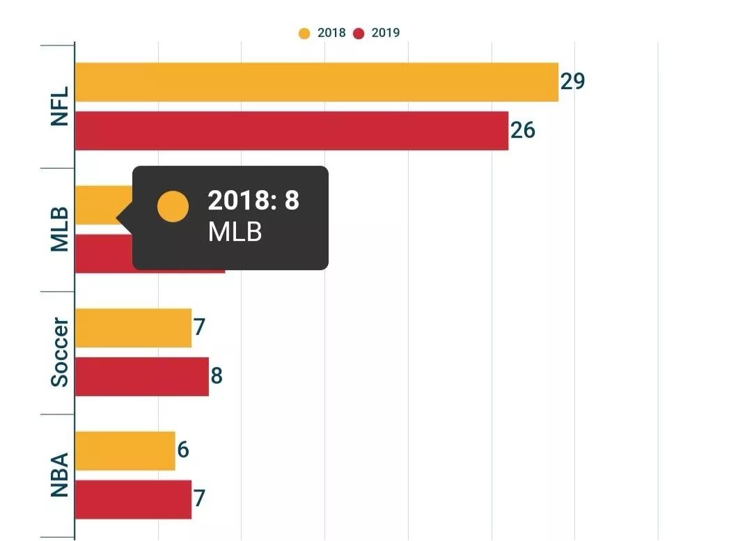 可以看出,NFL仍然是最具优势的体育联盟,50个最有价值的体育运动队中有一半以上是NFL,但其他主要体育项目在过去一年里逐渐削弱了它的领先地位。