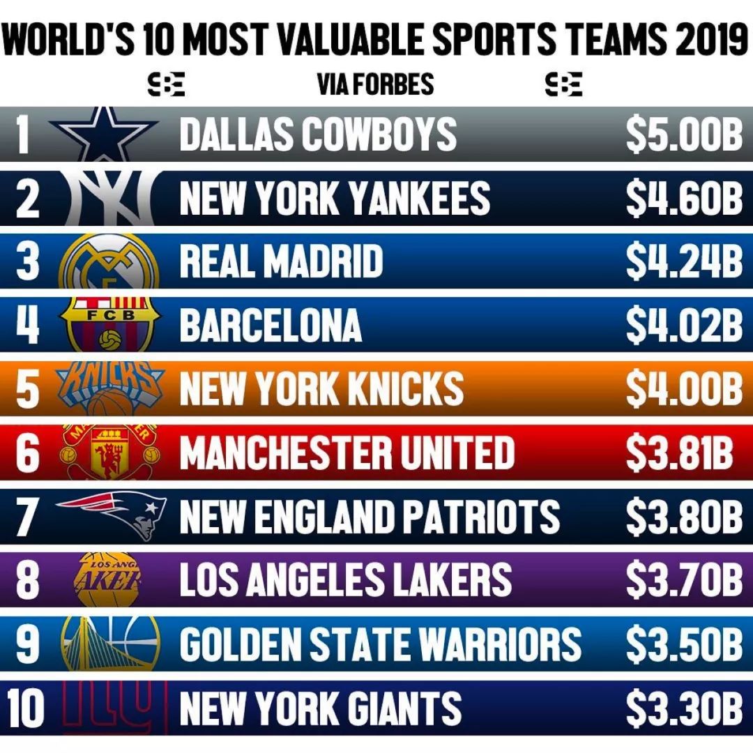 榜单中还有哪些你耳熟能详的运动队呢?圈哥跟你一起来看看。
