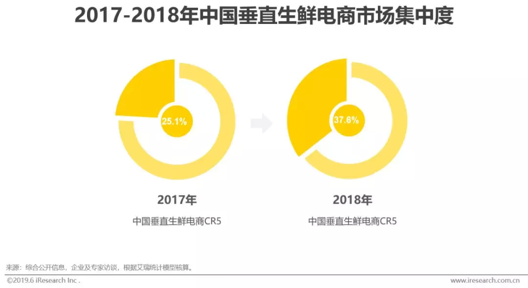 2018年中国垂直生鲜电商市场CR5占比37.6%,较上一年增加了12.5%,市场集中度快速提升,垂直生鲜电商市场已呈现出向头部集聚的趋势。