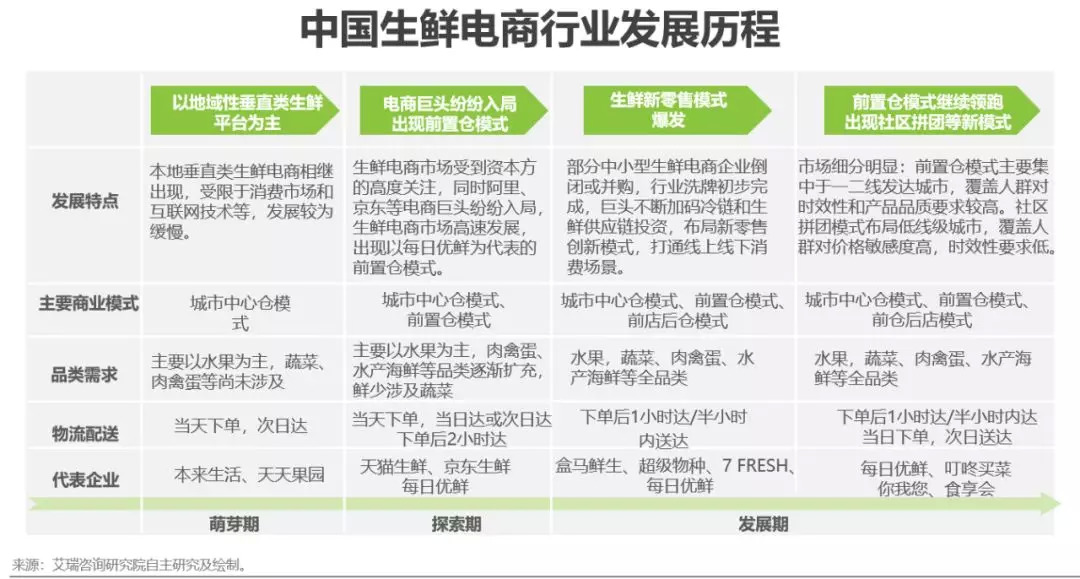 中国生鲜电商市场发展早期以地域性垂直类生鲜平台为主,随后,生鲜电商受到资本方的关注,同时电商巨头纷纷入局,行业快速发展,但由于生鲜电商面临高昂的物流成本及运营成本,部分中小型生鲜电商企业倒闭或被并购。现阶段,生鲜电商仍处于模式探索和高速发展期,尚未出现成熟的盈利模式,随着前置仓模式的持续火热,以及线上线下结合的新零售模式、社区拼团等新模式入局,生鲜市场的新一轮混战已然开始。
