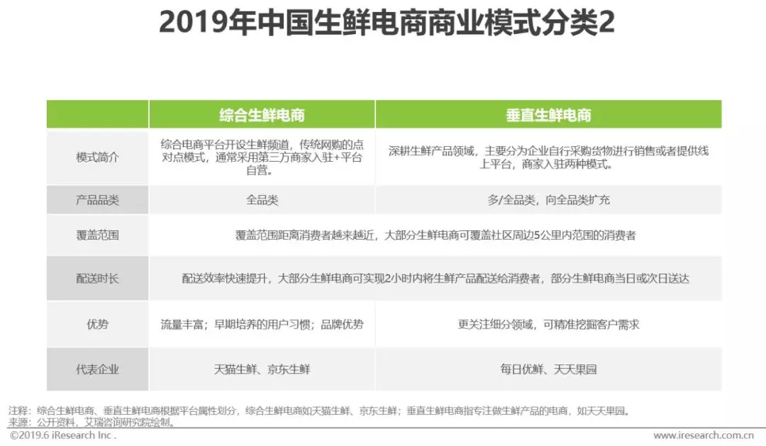 总体而言,我国生鲜电商模式可分为综合类生鲜电商和垂直类生鲜电商,两种模式各有优劣。综合电商模式有其规模经营、高市场份额和品牌效应带来的先发优势,并且有其他品类做支撑,导流较为容易。垂直生鲜电商专注做生鲜领域,更关注细分领域,对供应链把控能力较强,配送效率较高,消费者体验相对较好。