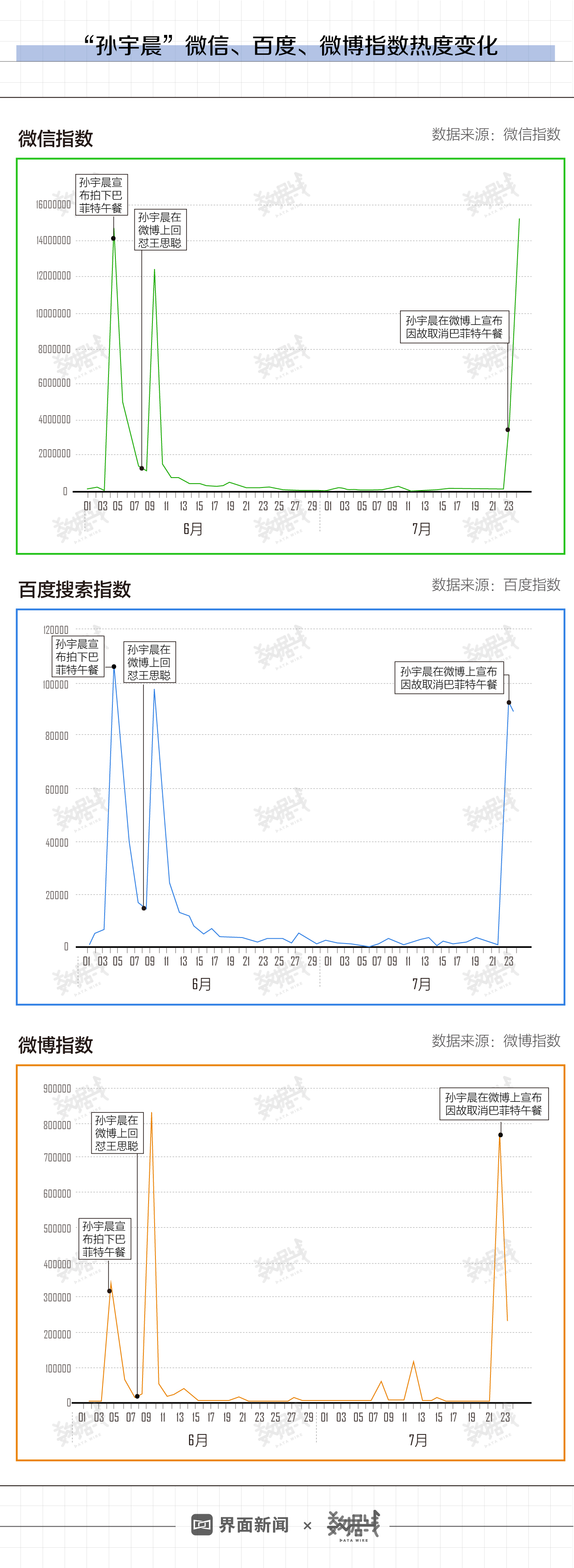 以“孙宇晨”为检索词,百度搜索指数、微信指数和微博指数均显示,其在6月4日宣布拍下巴菲特午餐、6月9日即回怼王思聪次日和7月23日宣布午餐因故取消这三个时间节点上热度飙升。