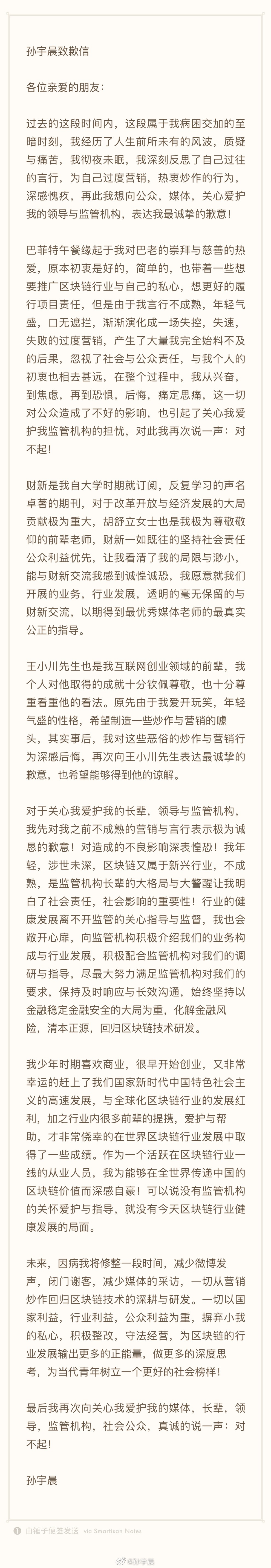 在发布的致歉信中,孙宇晨称为个人“过度营销”“热衷炒作”的行为深感愧疚,向王小川、财新、领导和监管机构以及公众致歉。