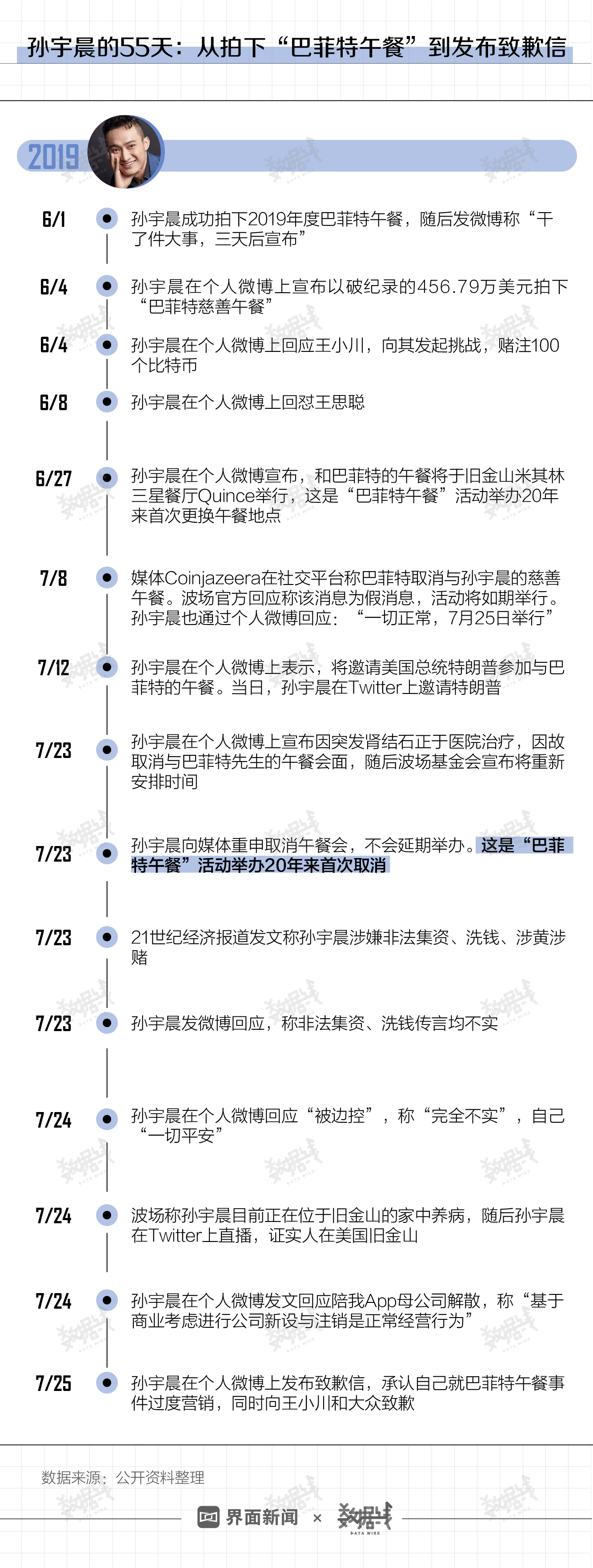 7月23日,孙宇晨在个人微博上宣布因故取消巴菲特午餐。这也是“巴菲特午餐”活动自2000年开始举办以来首次取消。从6月1日以创纪录的价格成功拍下“巴菲特午餐”,到7月23日宣布因故取消午餐,再到今天凌晨发布致歉信,55天的时间里,孙宇晨先后回怼王小川和王思聪、邀请特朗普赴宴、回应“被边控”“非法集资”等传闻,多次处在舆论的风口浪尖。
