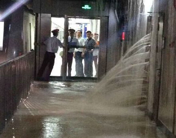 暴雨突袭武汉 地铁停运出现“龙吐水”景观。