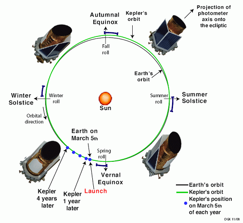 开普勒望远镜观测的目标区域位于银河系中的天鹅座和天琴座一带,因为这个区域存在较多的恒星及附属行星。开普勒望远镜并不在环绕地球的轨道上,而是在尾随地球的太阳轨道,所以不会像月球那样被地球遮蔽而无法持续观测。另外,开普勒望远镜每周两次与地球的指挥中心进行联系。