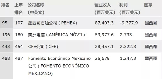比如,在最新的世界财富500强榜单上墨西哥一共有4家企业入选,分别是墨西哥石油公司、美洲电信、CFE(国家电力公司)、FEMSA(芬莎饮料公司),主要是资源型、消费型的企业。