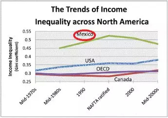 大量无家可归的农民进城,加剧了贫富差距。据统计,墨西哥最富有的20%人口所拥有的财富,是最贫困20%人口的20倍。