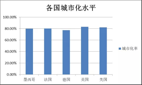 同期,英美德法的城市化也差不多在80%左右,号称“工业标杆”之称德国的城市化率甚至比墨西哥还低。