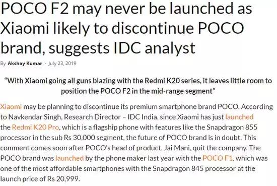 IDC印度市场研究总监 Navkendar Singh 透露,小米已经在印度市场发布了Redmi K20 Pro,这款旗舰级手机装备了高通骁龙 855 处理器,售价低于 30000 卢比 (约3000元人民币),其市场定位和 POCO 已经重合,因此小米可能计划停止其高端智能手机品牌 POCO。