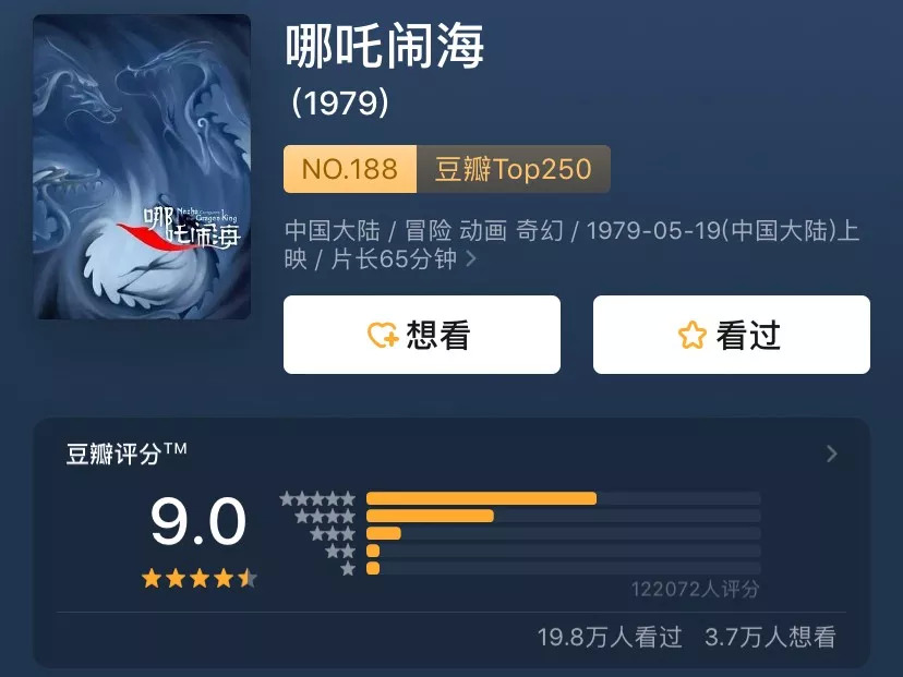 《哪吒之魔童降世》目前在豆瓣的评分高达8.8,是十余年来国产动画电影的最高分。实际上,对于中国的动画作品来说,早在40年前就有口碑不输的作品——1979年上海美术电影制片厂制作的《哪吒闹海》,超12万人评价,豆瓣评分高达9.0。