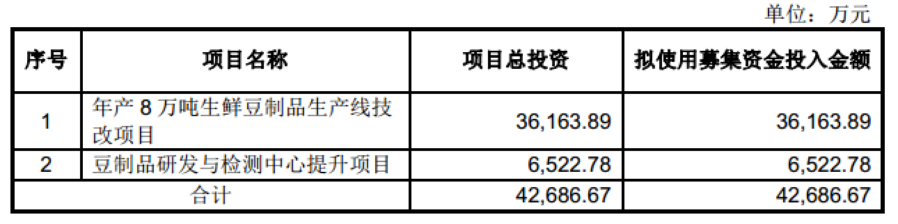 招股说明书称,“年产8万吨生鲜豆制品生产线技改项目”是顺应豆制品行业发展趋势,且募集资金投资项目达产后,可大幅度提升公司生鲜豆制品的生产能力,提升公司产品质量,丰富公司产品,完善和均衡的豆制品产品体系结构,提升公司在生鲜豆制品市场的占有率,巩固公司的行业地位。